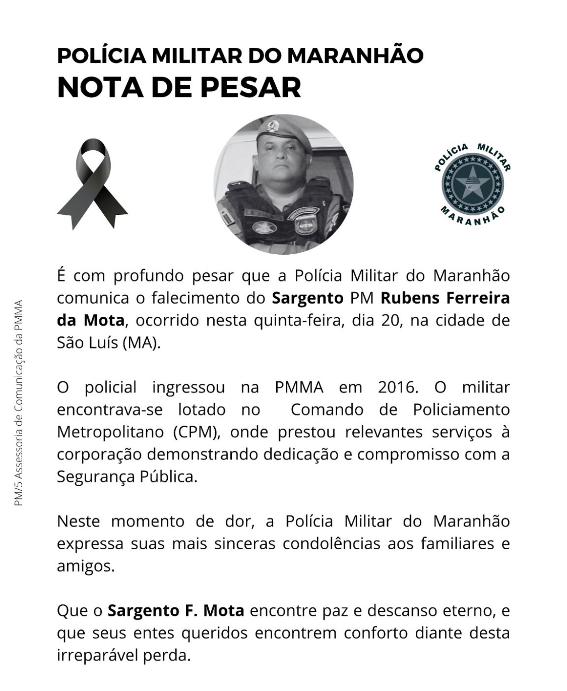 O sargento Rubens Ferreira da Mota, lotado no Comando de Policiamento Metropolitano (CPM), morreu após uma ocorrência registrada na noite de quarta-feira (19), no Bairro de Fátima, em São Luís. Ele chegou a ser internado em estado grave, mas não resistiu.